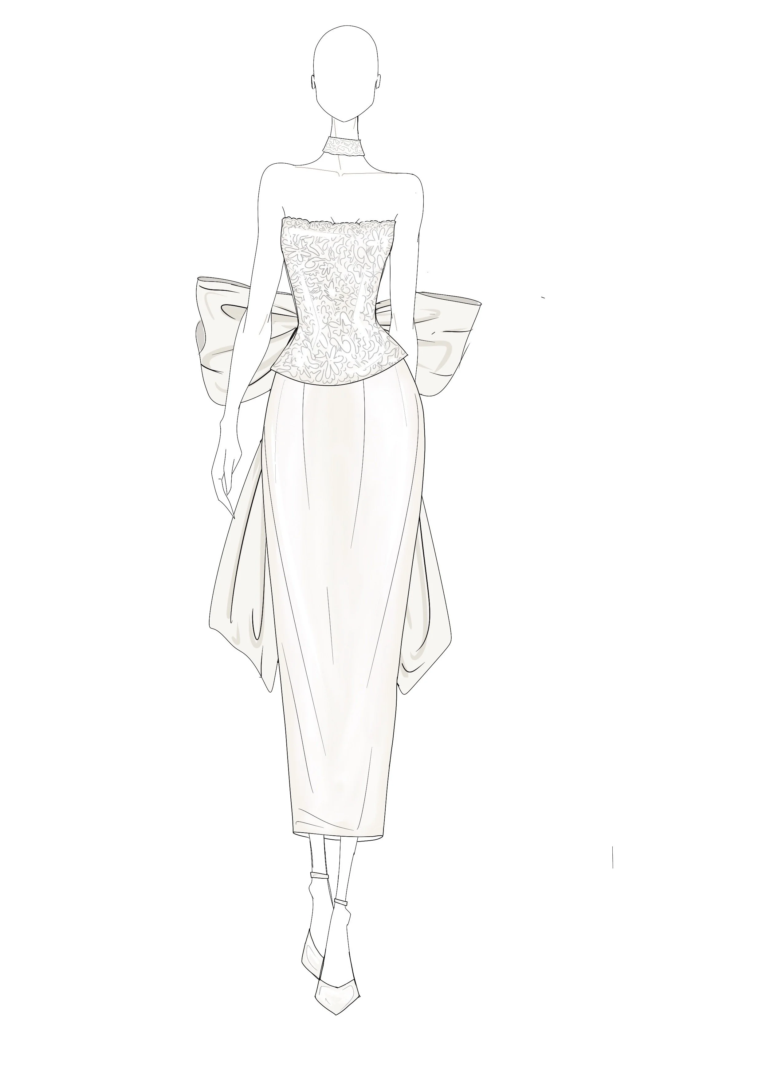 Additional fabric from skirt and petti-coat was used to create a detachable overskirt. The bow on the veil became a detachable bow that could be worn on top of the overskirt or without.